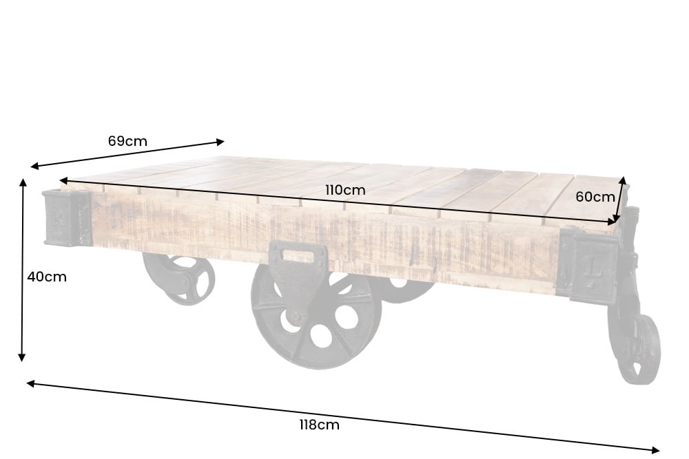 Solide design salontafel RAILWAY 110cm mangohout met 4 wielen – 36788