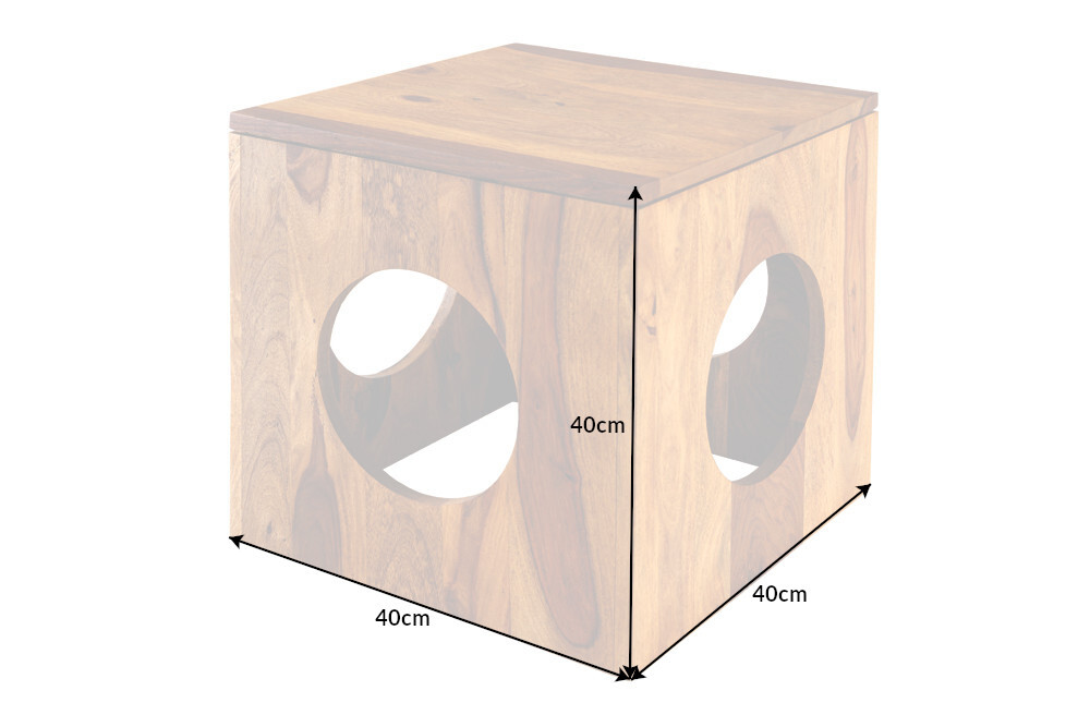 De massieve CUBUS bijzettafel presenteert zich als een bijzonder vormgegeven meubelstuk: een unieke nerf van het sheeshamhout en ronde uitsparingen geven de tafel een extravagante uitstraling. De prachtige nerf en de individuele houtkarakteristieken zorgen voor een natuurlijke flair in uw huis. Door het ruimtebesparende formaat is de kubusvormige tafel ook perfect voor kleinere woonkamers.
