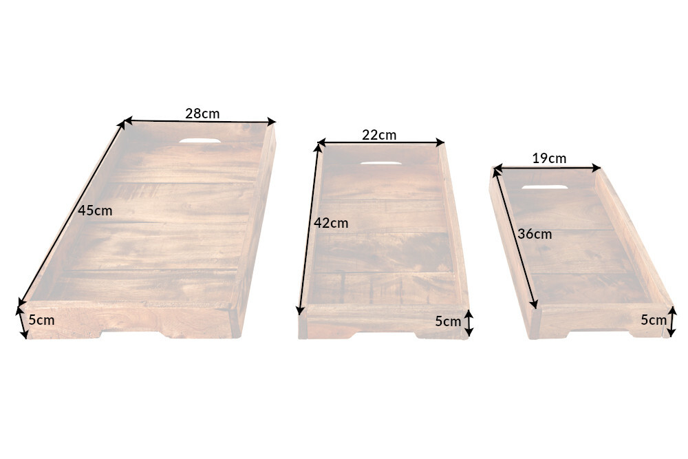 De HEMINGWAY dienbladset van 3 maakt indruk door zijn natuurlijke charme, uitstekende afwerking en hoogwaardig materiaal. Om te serveren, als stijlvolle decoratie of als plek voor brieven – de houten dienbladen overtuigen door hun hoogwaardige afwerking, zowel functioneel als optisch. Het oppervlak van de rustieke woonaccessoires is verzegeld met een transparante blanke lak om het hout te beschermen, zodat het perfect beschermd is.
